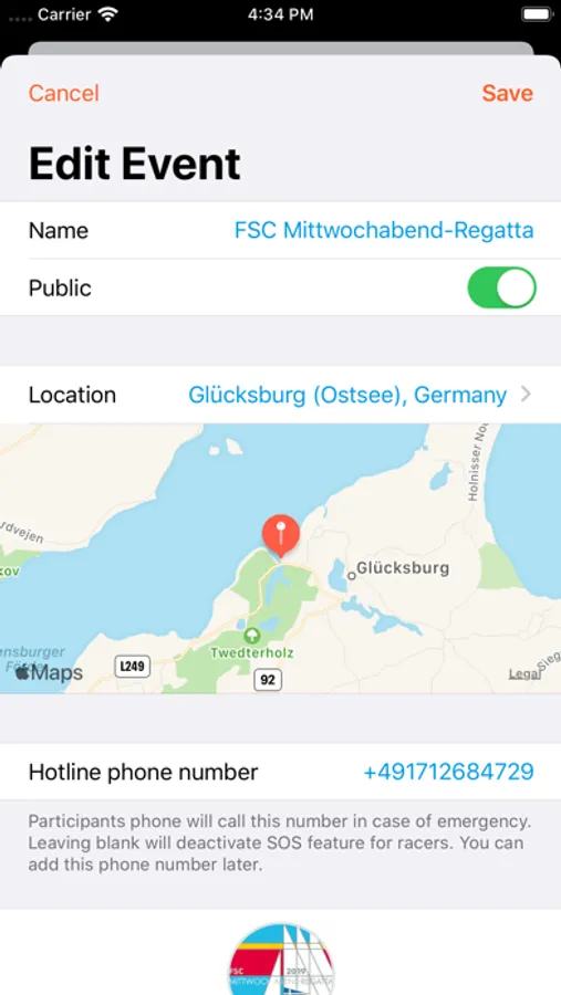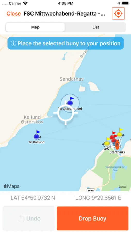 In real life take your phone aboard the organiser boat in charge of setting up the waypoints of a race and use the application to reposition the selected provisional buoys in the desired final locations for the race you are building. The revised location settings will be automatically transferred to your regatta as final buoy positions.
