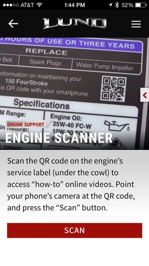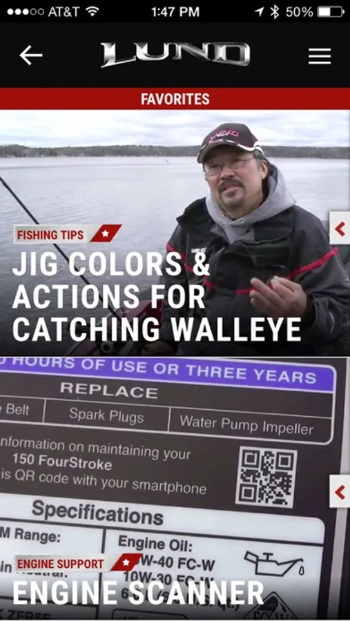 The Lund Tour Guide App is packed with great information for you. Maintenance, fishing tips, and other tricks to provide you with the ultimate fishing experience. Also included in Engine Support is a QR Code reader for scanning your Mercury motor to access manufacturer resources. Bookmark frequently accessed tips using the Favorites tool.
