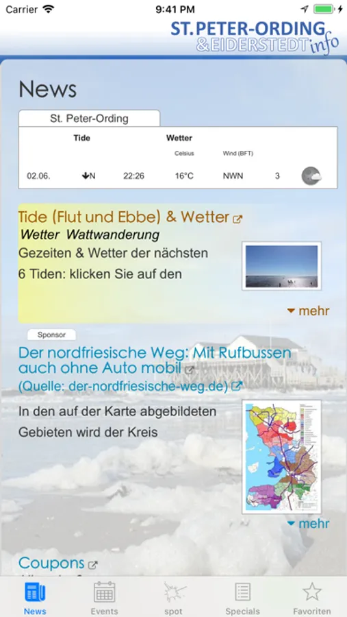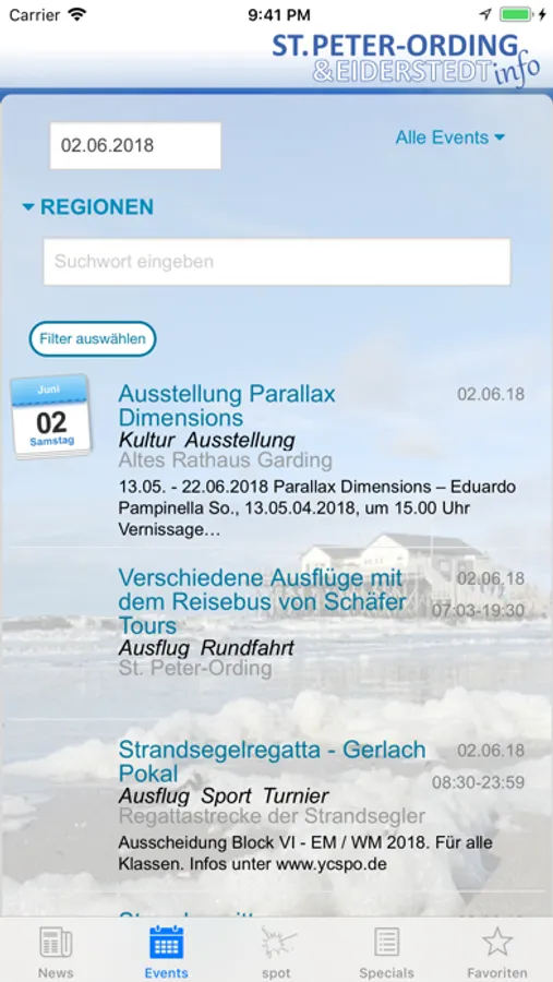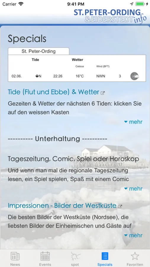Diese kostenlose App aus und über St-Peter-Ording und ganz Eiderstedt ist der nützliche Begleiter für die Planung, Buchung und Durchführung ihrer Reise. Mit Hilfe einer Volltextsuche, eines Kalenders oder verschiedener Suchen nach Kategorien und Merkmalen können die Informationen selektiert werden die den Bedürfnissen und Bedarfen am besten entsprechen. Die Zusammenstellung von Favoriten als Urlaubsplaner stellt die Interessen übersichtlich zusammen. Neben der alphabetischen Darstellung ist auch die Darstellung nach Entfernung oder auf einer Karte möglich. Neben einer kurzen Info zum Objekt (Restaurant, Sehenswürdigkeit, Hotel, u.v.a.m.) stehen auch alle Kontaktmöglichkeiten, Alternativen zur Suche und gegebenenfalls Bewertungen zur Verfügung.