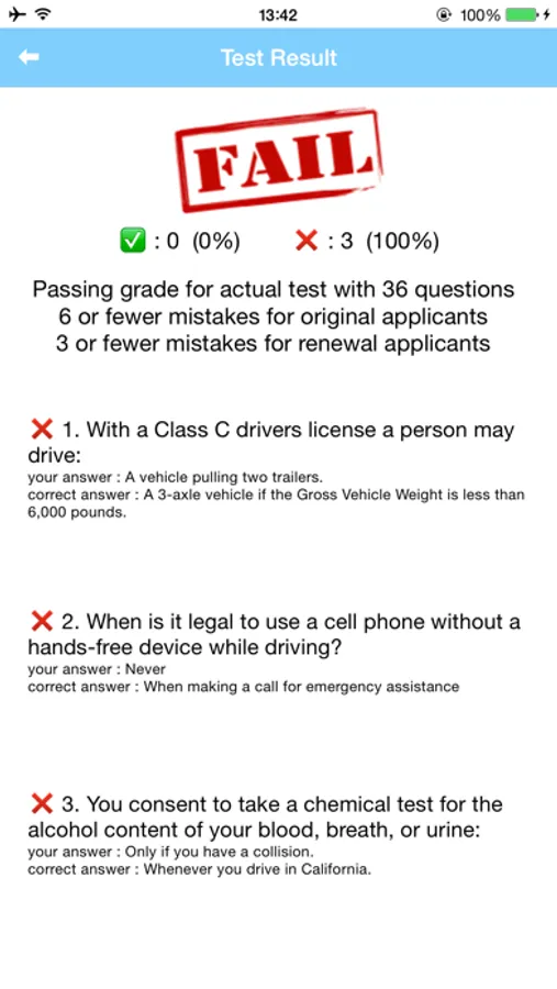 - Measured exactly as the real CA DMV written test ( total 36 DMV questions, 6 or less mistakes to pass for new applicants, 3 or less mistakes to pass for renewal applicants ).