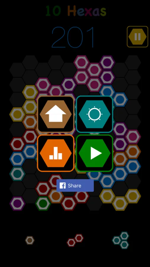 Once full line is filled with hex, all the hex from that line will destroy if there is 10 hex in line (Less than 10 hex in line will not destroy).