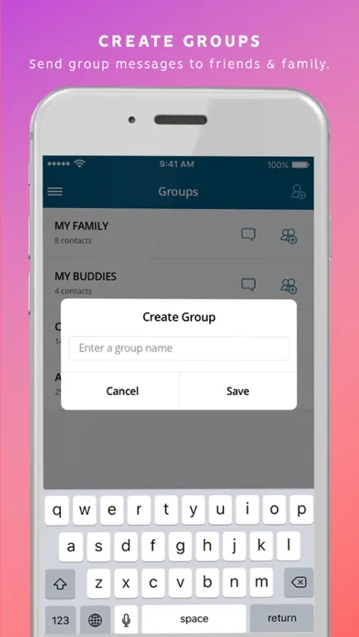 Group Messaging - Create groups of family and friends or select group contacts based on their network.