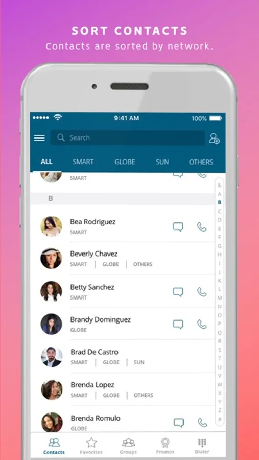 Sort Networks - Automatically identifies and sorts all your contacts by network. Friends with multiple numbers will appear under one contact with their networks specified.