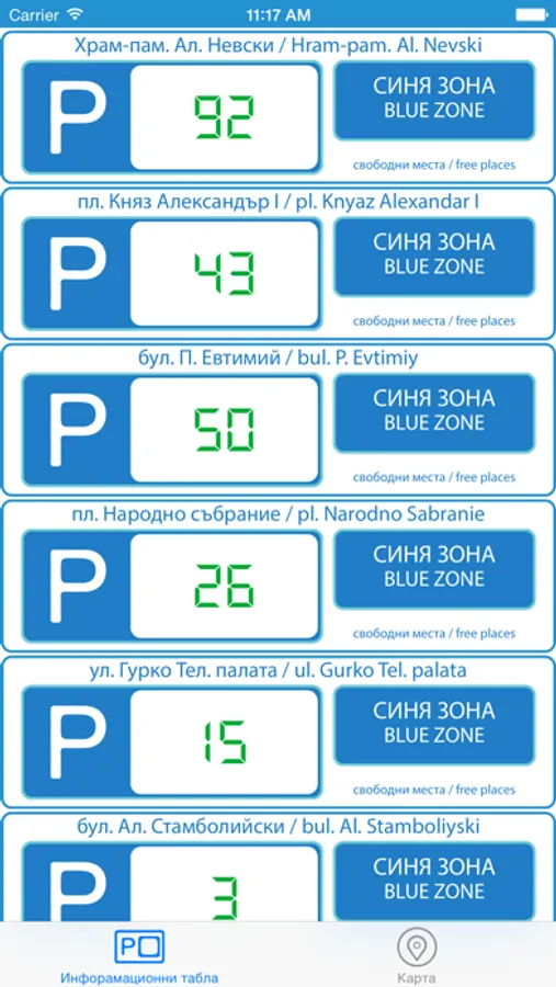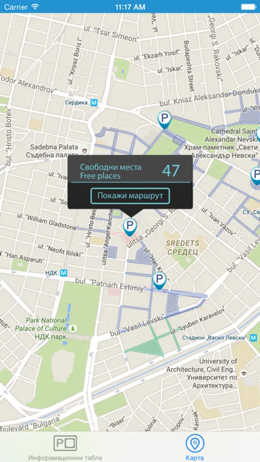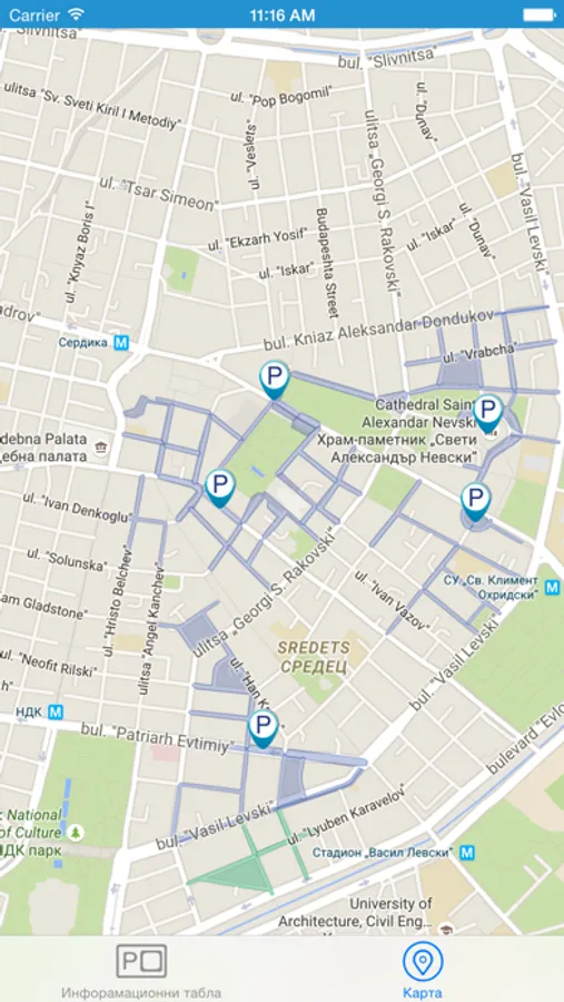 София Паркинг е приложение, което в реално време показва свободните парко места на определените от Център за Градска Мобилност ЕАД паркинг зони.