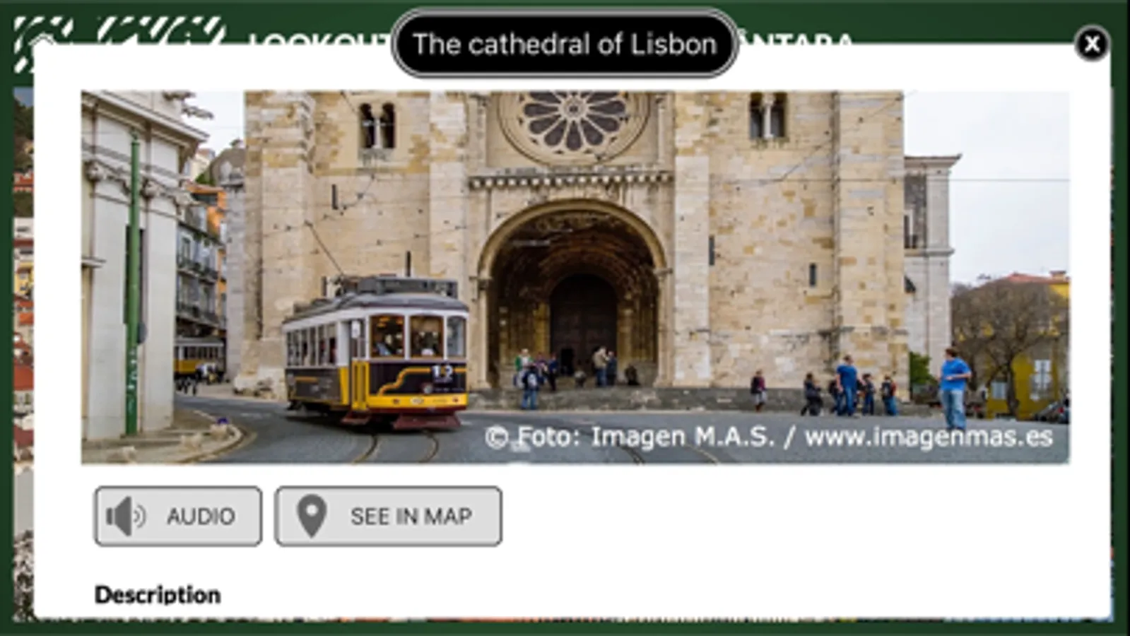 Very intuitive and easy to use, the application shows you information about the most attractive places in the city of Lisbon through an image. A memory in your phone of a unique view.