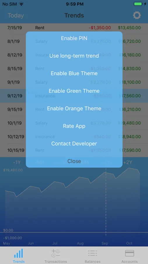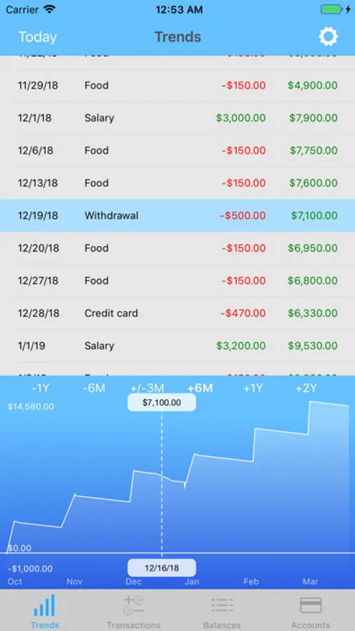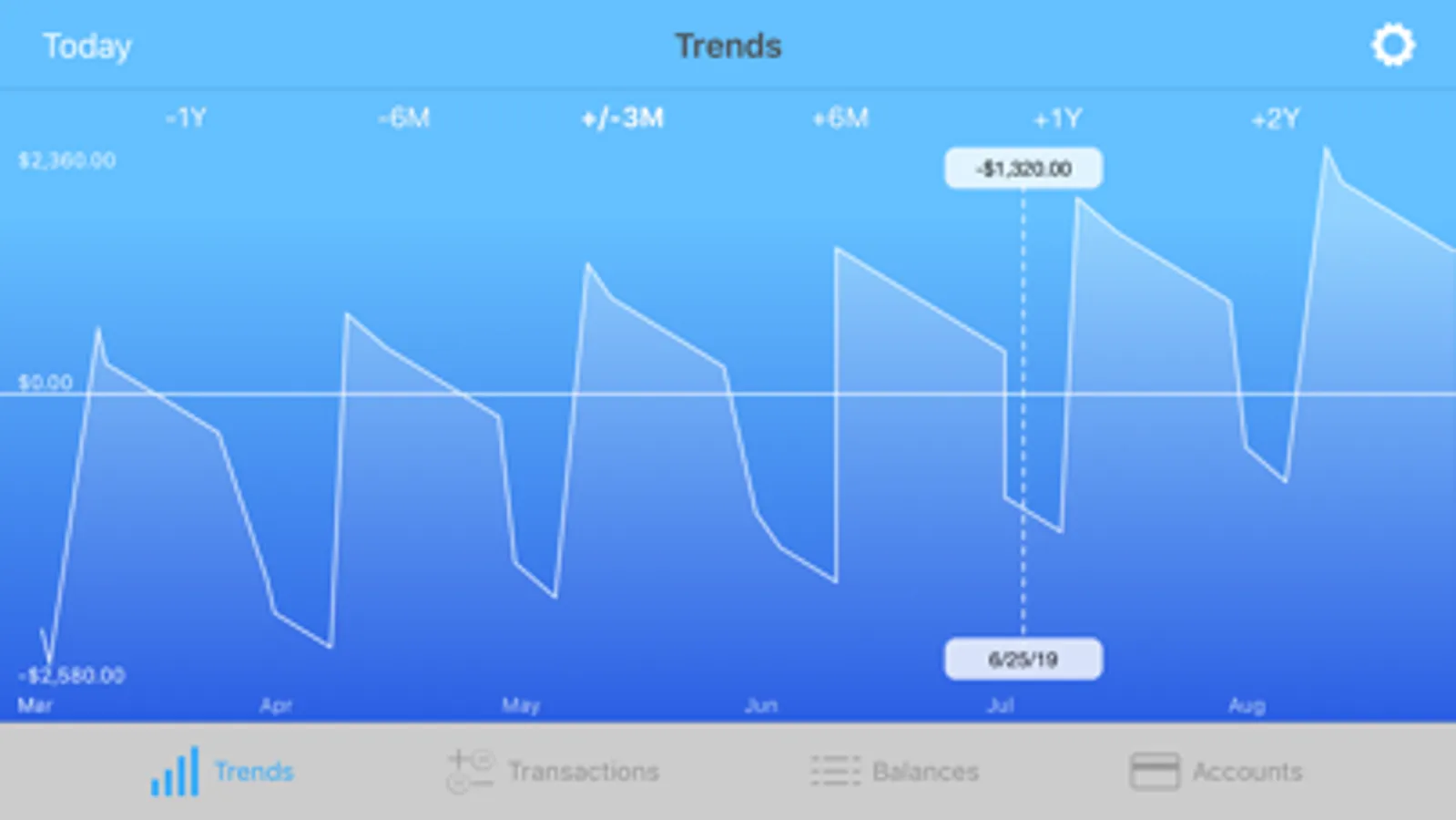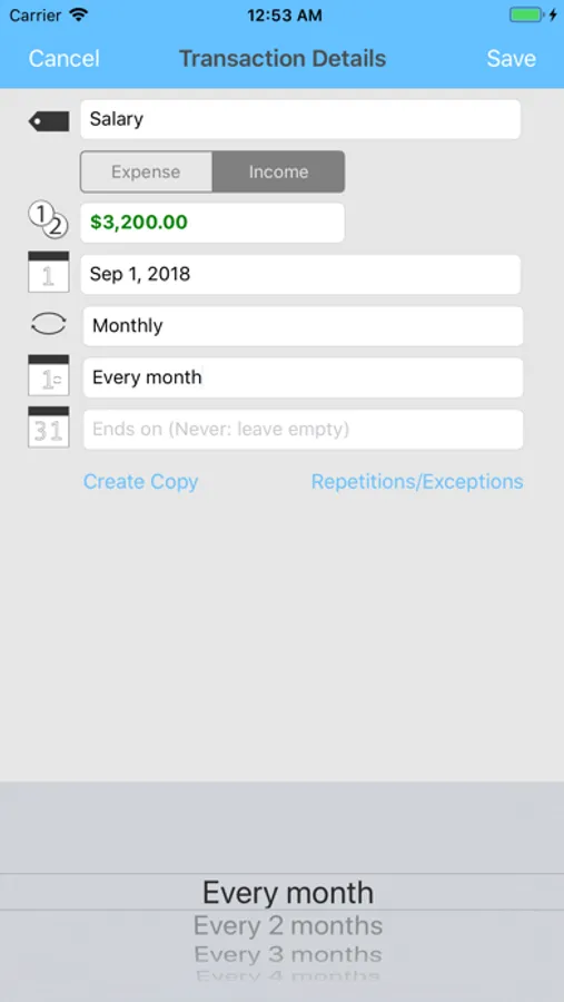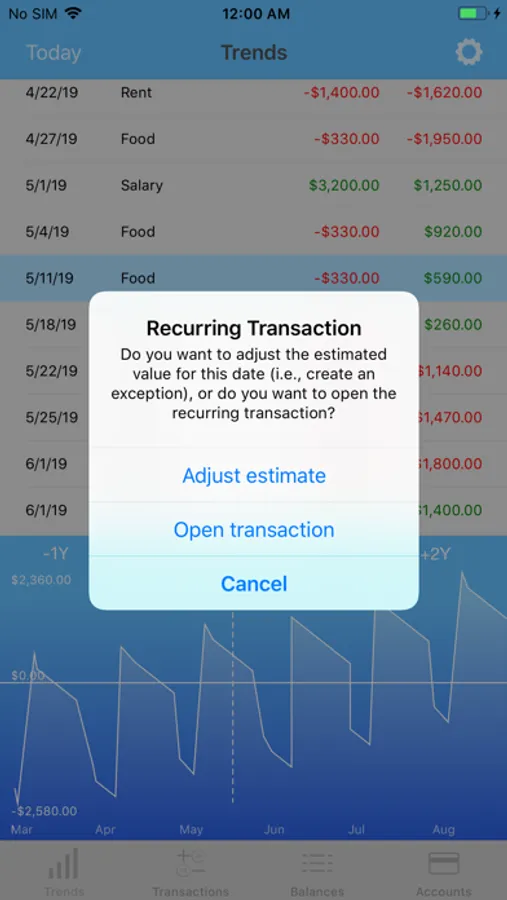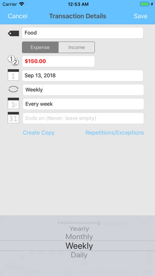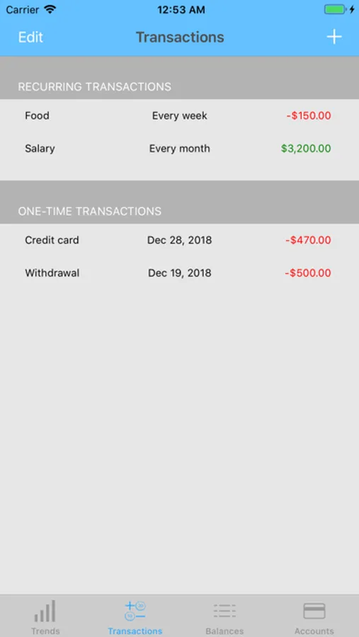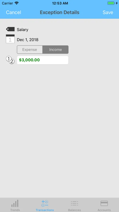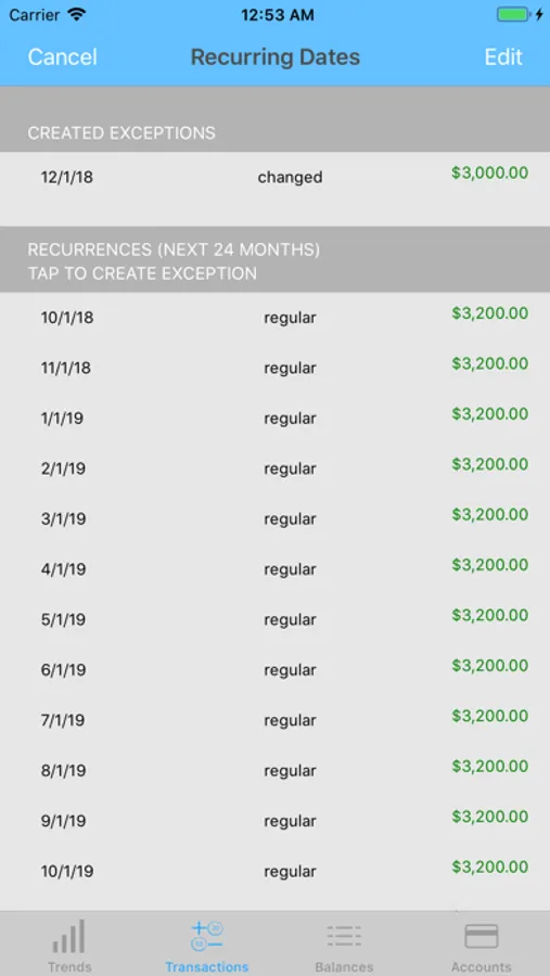 5) Adjust the actual value of a recurrent transaction for specific dates only. Simply double-tap the recurring entry in the trends view to adjust (by creating a 'Transaction Exception')!