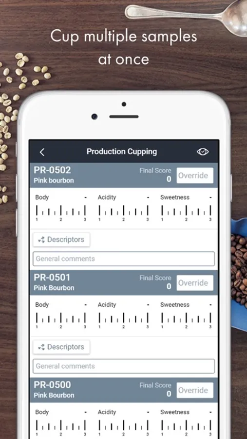 Cropster Cup lets you record cuppings even when the internet is unavailable. Results are stored locally, then automatically sync to your Cropster account when you’re connected again.