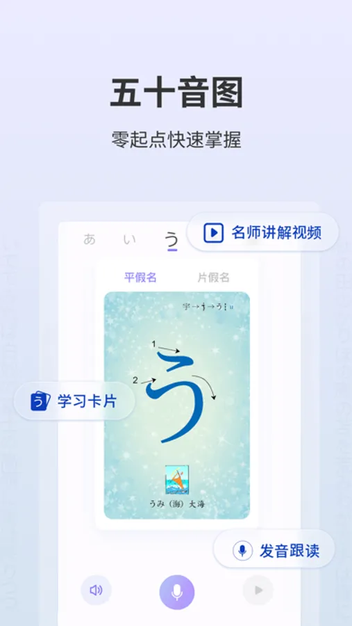 专为日语初学者精心设计五十音图卡片,包含日语假名的发音、书写、罗马音表记方式等,同时配套高校日语专业教授精讲视频,手把手教会日语五十音的写法和声调。