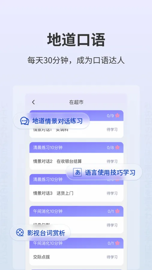 --情景式设计,分场景提供日语发音练习素材,帮助用户身临其境地感受日语思维方式、学习日语口语表达。