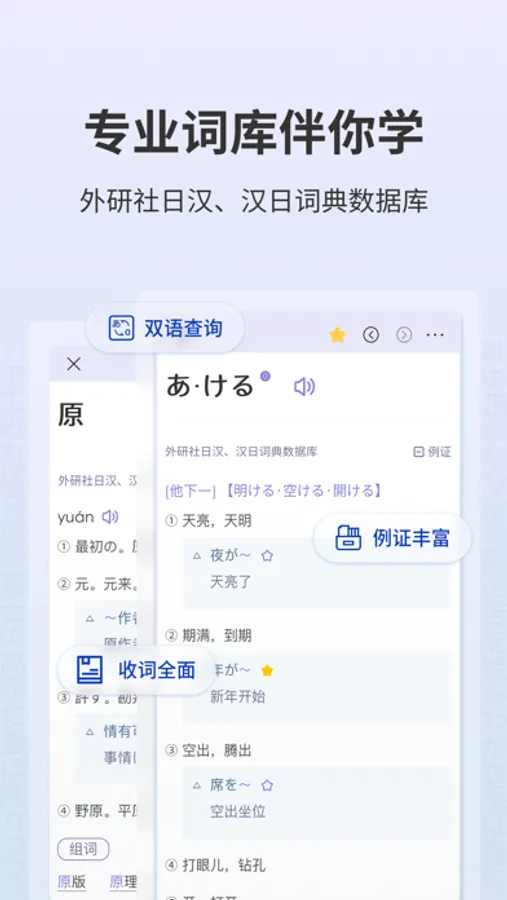 日汉、汉日双向查词服务,融入智能联想技术,一站式查遍词目、短语、例句。