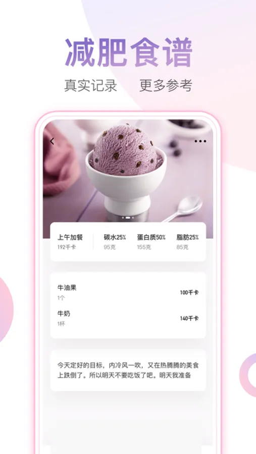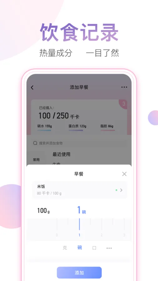 2、饮食记录:官方食物库数据超过50万种,社区用户共享的自定义食物超过60万种,更有多种专业减肥食谱为你定制,自动匹配你的当前体重并智能检测营养搭配比例,同时也支持常见运动的记录和自定义
