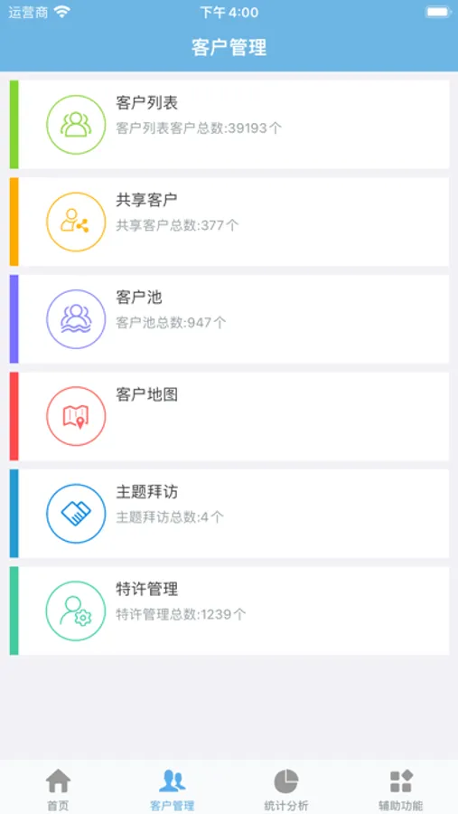 “行销”主要由工作安排、客户列表、统计分析、消息提醒和辅助功能五大模块组成。各模块详细功能如下: