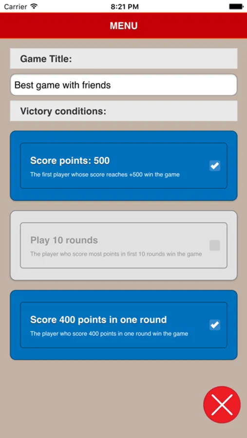 • Define custom game victory criteria (play till someone scores 500 points, or play predetermined game time, etc).