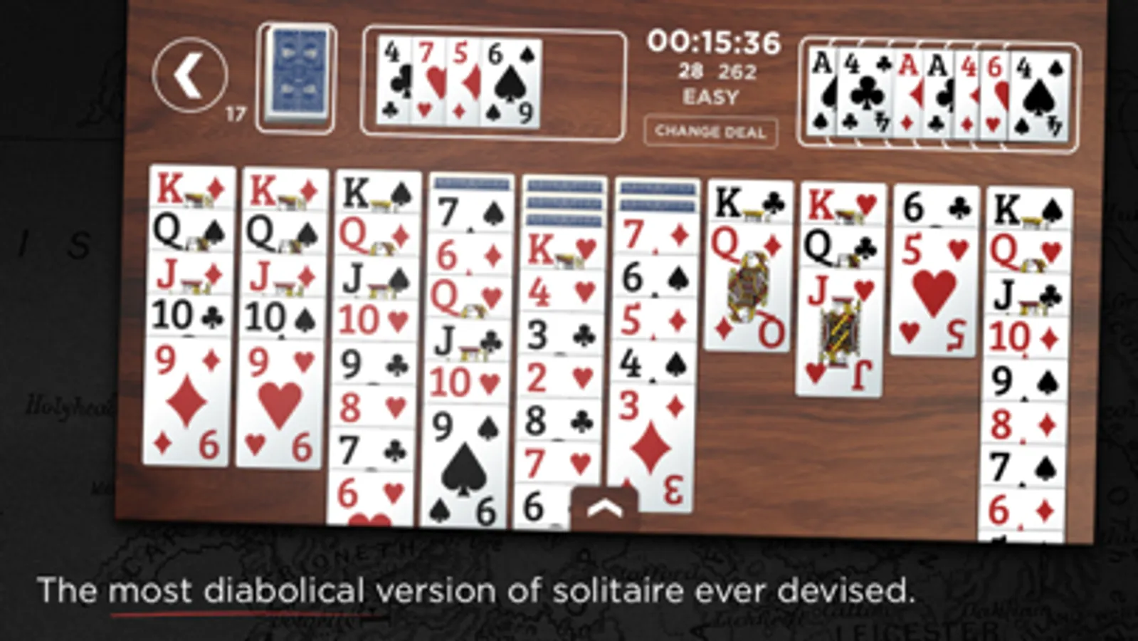 Featuring unique gameplay with two decks of cards and an added challenge of liberating cards contained in a row called the Devil’s Six, this addictive game will keep you coming back again and again. No game of solitaire will keep your mind as sharp or improve your concentration like Churchill Solitaire.