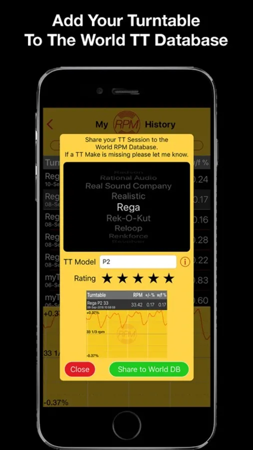 The World RPM Turntable Performance Database now has over 10,000 submissions from RPM users worldwide to build the ultimate resource for researching the most accurate turntables out there. Upgrade to join in and upload your own turntable data, go to Settings and make sure you have the Freeze time set then do an RPM session as normal. At the end of the time you will be asked to name your session after which you will have the option to also upload it to the World DB. You can always upload from History later too.