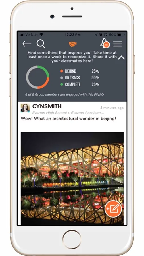 FINAO® [FIN-Ā-O] provides anxiety-free (no bullying, no bashing, no drama) creation, tracking, and sharing of goals, called FINAOs. FINAO is your school's mindset and passion for being the best version of one’s self, by one’s own definition of success. It's all the things that matter most to you. So find something you love and LIVE it.