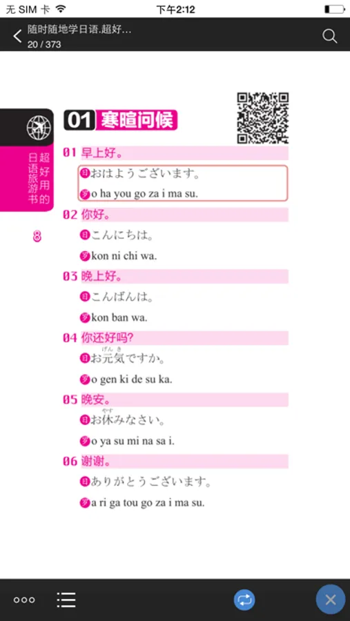 该APP从临时应急一句话开始,分场景给出重要词汇、常用短句及实用迷你会话。本APP分类全面、详细,让大家可以快速查找到需要的旅行用语,同时能够学到旅游中最In的口语表达和词汇。不但帮助你学会这些表达,同时还能知道如何应用,增加其在旅行中的实用性。日本自由行必备!