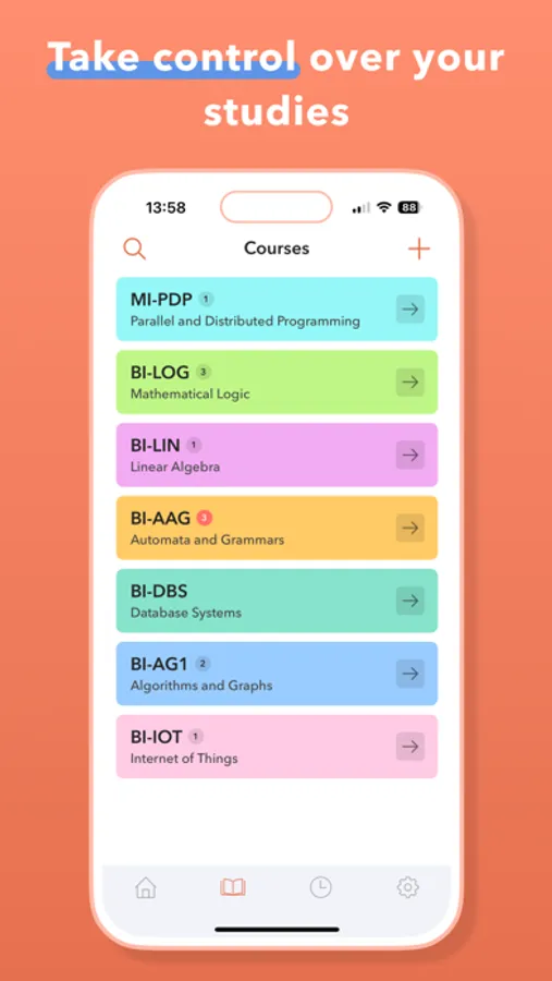 Add a short name, full name, notes, and teacher, and customize the color of the course on the Study Manager app. Create a full course list and make it beautiful.