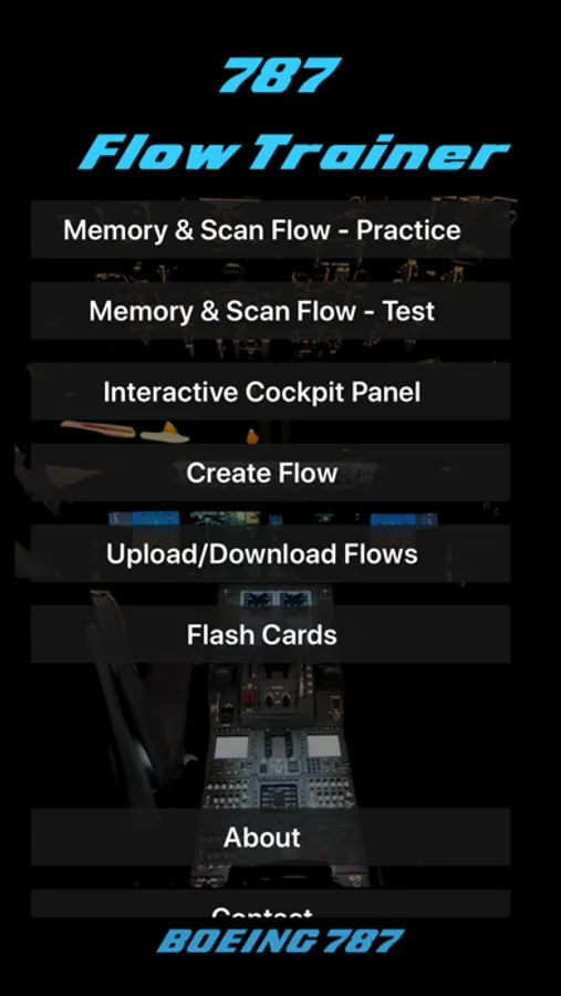 The 787 Flow and Emergency Trainer app is an interactive tool for 787 pilots to learn the cockpit, scan flows and different Memory items.