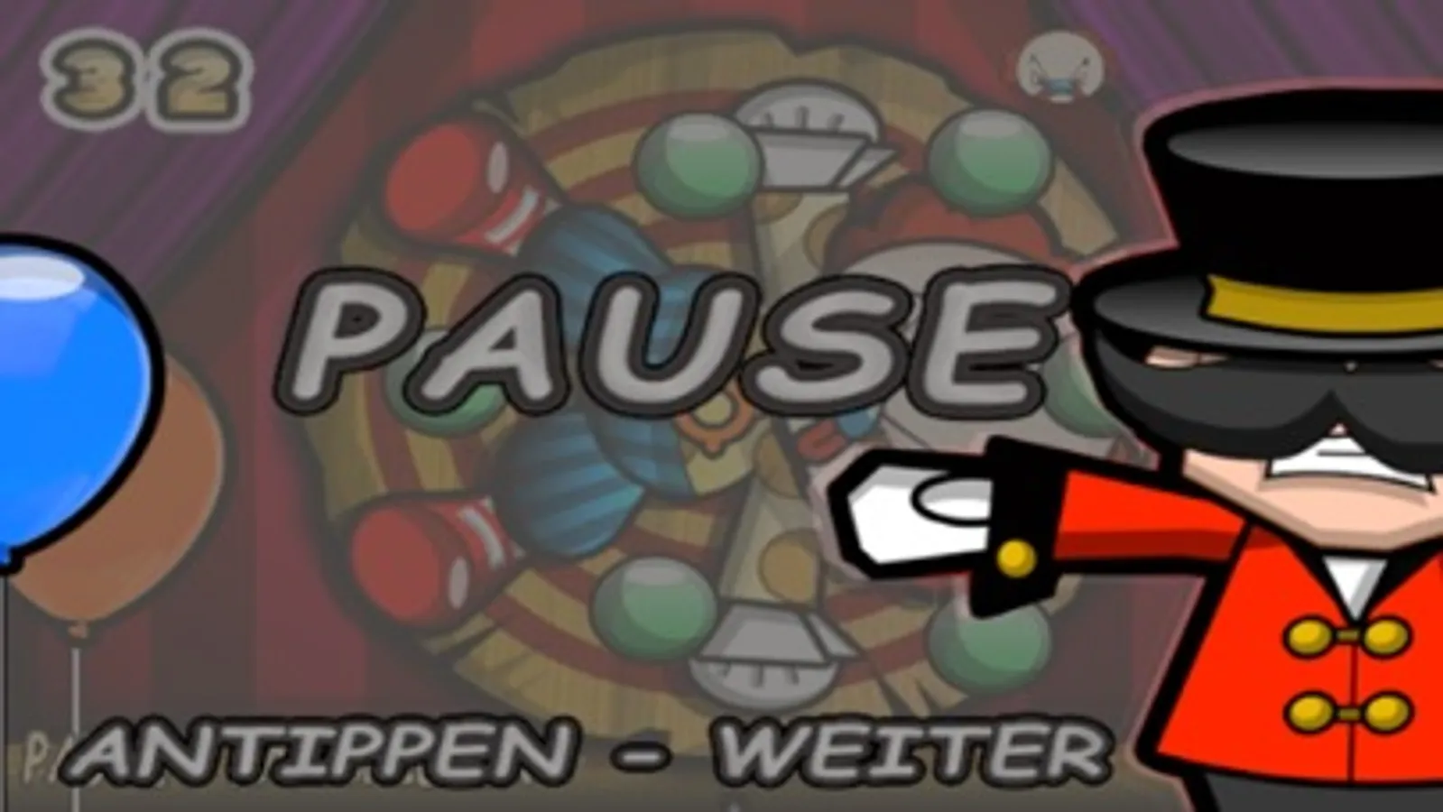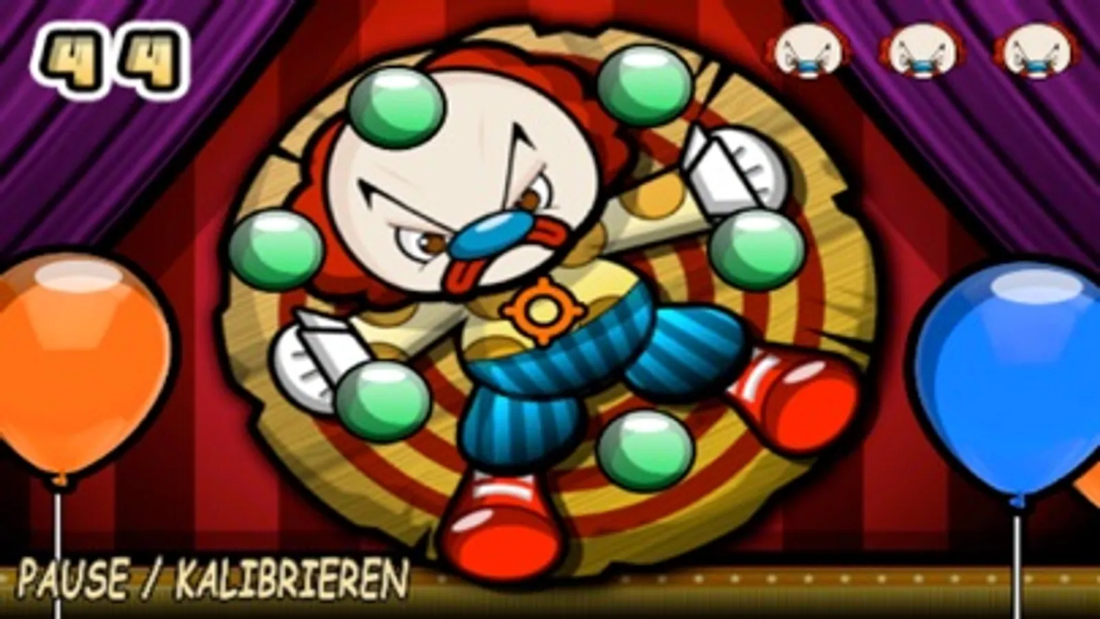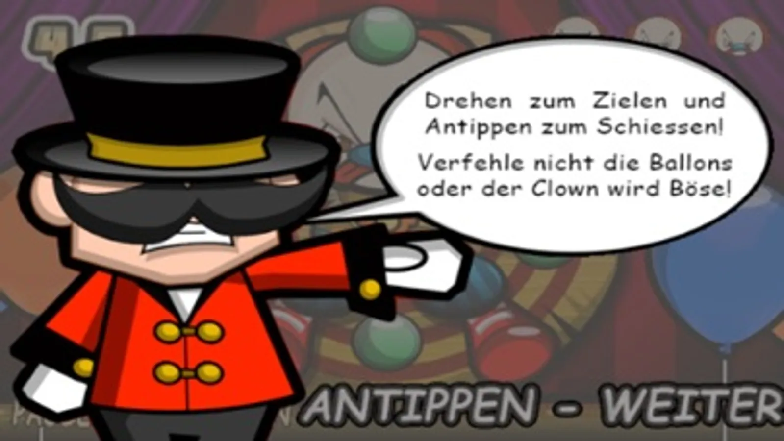 Zum Zielen musst Du das Gerät Neigen und Drehen. Wenn der Ballon im Fadenkreuz ist tippst Du auf den Bildschirm zum Werfen. Aber pass auf das Du triffst oder der Clown wird wütend!