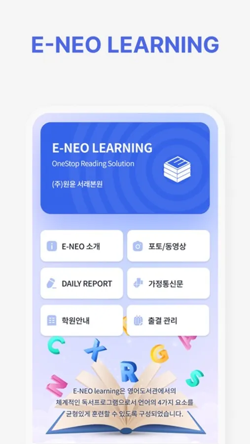E-NEO learning은 자기주도적 영어원서 읽기학습의 도움을 줄 수 있는 영어원서의 이해력, 어휘능력을 측정, 향상시키는 통합적이고 체계적인 프로그램 입니다. 영어독서로 언어를 학습 하게 되면 언어능력뿐만 아니라 책을 통한 영미 문화권의 간접체험 및 사고력이 함께 성장 할 수 있습니다. 단지 암기 위주가 아닌 개개인의 능력과 레벨에 맞는 정확한 진단과 학습평가로 언어능력을 성장시킵니다.