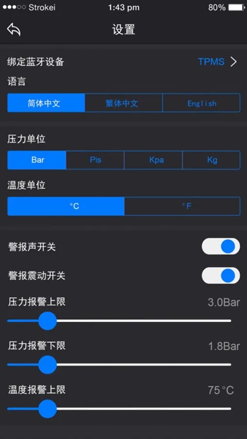 3、APP支持中文、英文语言设置;四种气压单位(Bar、Psi、Kpa、kgf/cm2) 以及两种温度单位(℃,℉)的设置。
