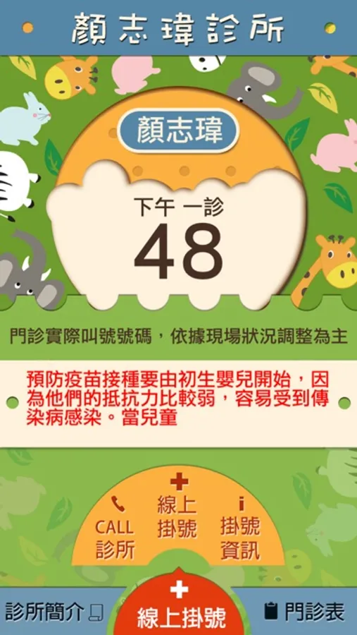 顏志瑋診所為專業兒科診所,為了提升服務品質,APP提供線上即時看診進度,可減少患者及家長辛苦來回奔波和長時間等待候診。