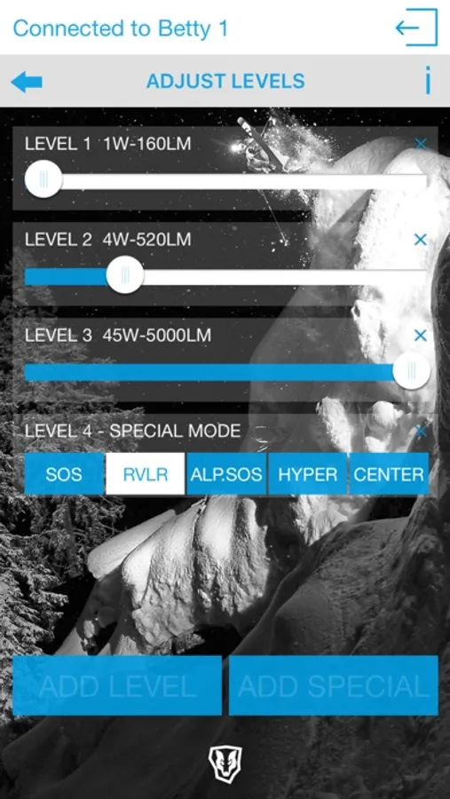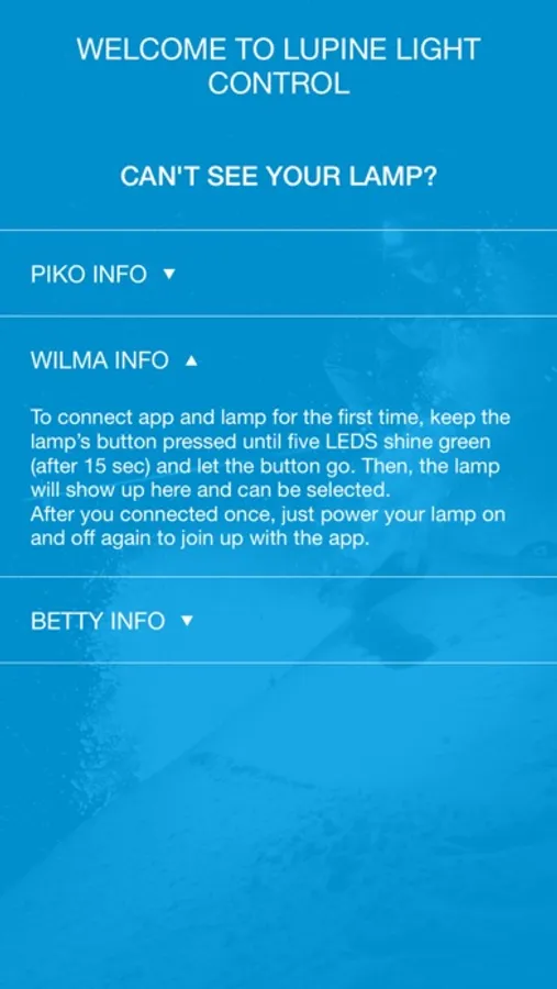 Wilma/Betty: Open the app, hold the button of the light pressed until 5 green LEDs light up. Release the button. Light and app will connect automatically.