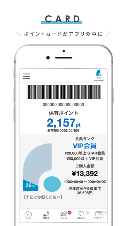 ・このアプリは「F・O・インターナショナルポイントカード」のカード・ポイントを表示することができます。
