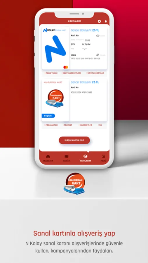 KahramanKart uygulamasına hemen üye olarak N Kolay sanal karta sahip olabilirsiniz. Sanal kartınıza para yükleyerek internetten yapacağınız alışverişlerinizde güvenle kullanabilir ve çeşitli kampanyalardan yararlanabilirsiniz.