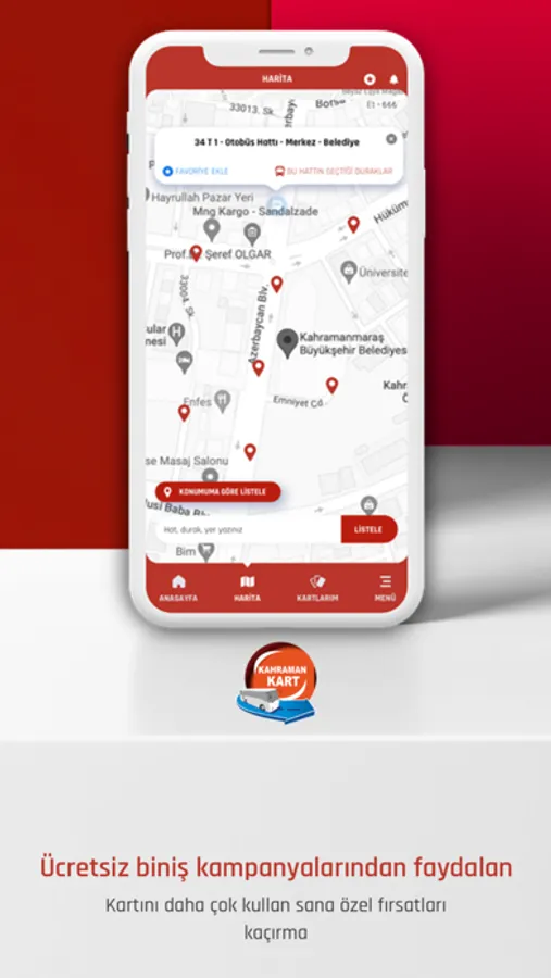 KahramanKart uygulaması ile haritadan çevrenizdeki durakları görebilir, otobüsünüzün ne kadar süre içerisinde geleceğini takip edebilir ve duraktan geçen hatları izleyebilirsiniz. Durakları, hatları veya istediğiniz herhangi bir noktayı favorilerinize ekleyebilir, otobüs geliş saatlerine göre alarm kurabilir ve otobüsünüz istediğiniz durağa yaklaşmadan önce bildirim alabilirsiniz.