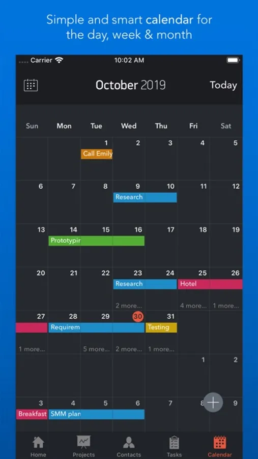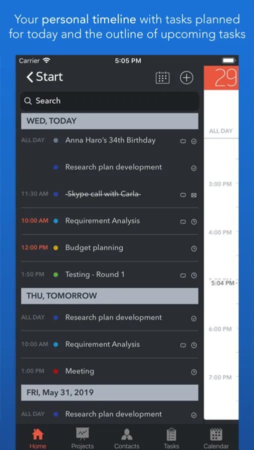 • Start scheduling each new day on Home screen. Here you will find your current projects and to dos: a timeline with tasks you have planned for today and outline of upcoming tasks. Home screen allows you to focus only on current tasks, planned for today, and not to get lost in plenty of other planned tasks. You can plan your day directly from Home screen creating new tasks, projects, contacts and companies