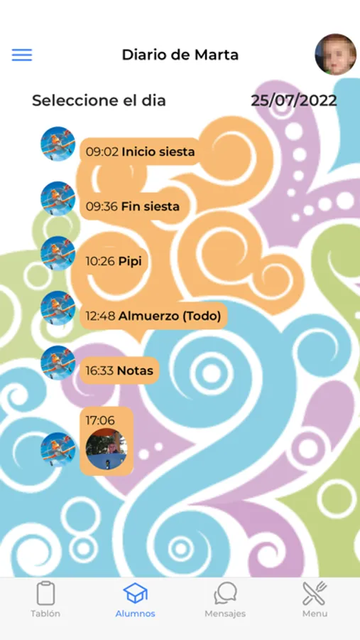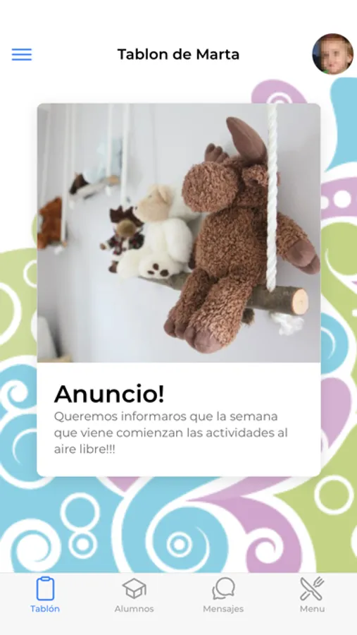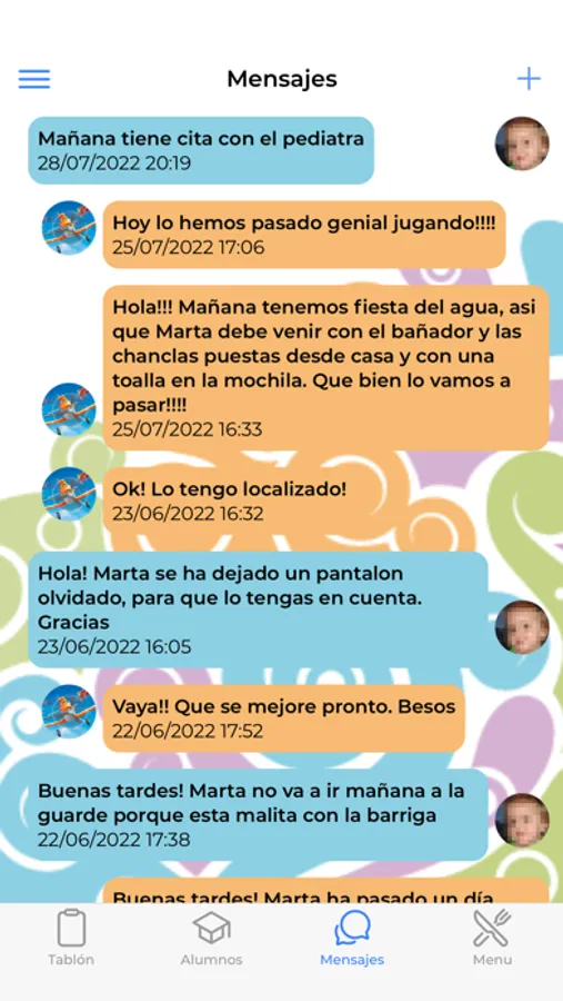 Aplicación para la comunicación ente Padres y responsables y cuidadoras de guarderías. Mediante una aplicación de gestión en las guarderías, los responsables y las cuidadoras alimentan de información sobre las actividades de los niños, informando a los padres a través de esta app de las actividades de sus hijos. Los padres están al tanto de lo que sus hijos hacen a diario en la guardería, al tiempo que disponen de una herramienta de comunicación con las cuidadoras sobre avisos de quieran poner en su conocimiento ("esta noche no ha dormido bien", "tiene la barriga suelta, echadle un ojo", etc). La app también dispone de un tablón de anuncios, que los responsables de la guarde pueden usar para anuncios y comunicaciones que deseen poner en conocimiento de los cuidadores. Cada padre solicita previamente a los responsables de la guardería el acceso a la aplicación. La guardería suministran un acceso al padre (usuario y contraseña) y accediendo a la app, los padres pueden ver todo lo relacionado con sus hijos (tantos como estén matriculados en la guardería en cada momento).