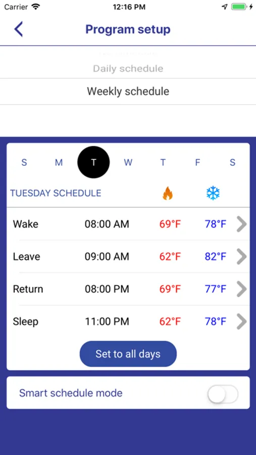 IotGizmo Corporation has developed a home automation application that works on IotGizmo hardware. This application running on smart phone controls Home Thermostat via celluar network or WIFI network talks to a cloud server. Using this application home owner can control house temperatures by activating Heat/Cold/Fan modes of the iotGizmo thermostat. This application has ability to 'Schedule Seven Day Programming' or 'One Day' programming to HEAT/COOL the house. This application can initialize iotGizmo thermostat WIFI password via smart-config protocol. Future release of iotGizmo application also monitors amount of time heating/cooling system has been used and could compute energy usage using back-end cloud servers and email an 'Energy Consumption Report'.