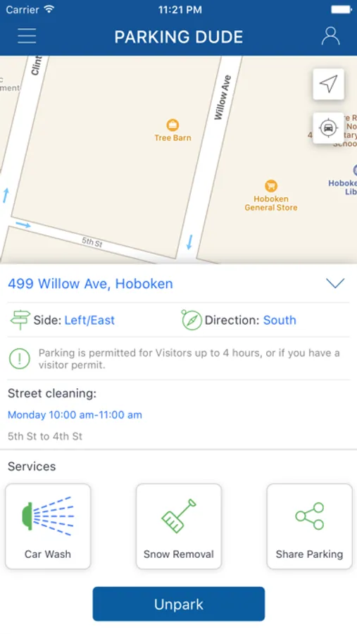 Parking Dude – Hoboken Residents helping each other own a car and park it easier and less costly. The Dude helps residents and visitors of Hoboken, NJ navigate every aspect of the strenuous parking situation that currently exists. With a grid that was specifically built for the city of Hoboken with every street parking spot characteristic (visitor or resident side, street cleaning day and times) already inputted, the Parking Dude creates an application where each user can easily identify where to park safely and how to avoid being towed, booted, or ticketed. The application will smoothly and quickly identify your geographic location on the grid and permit the user to select which parking spot is being parked at.
