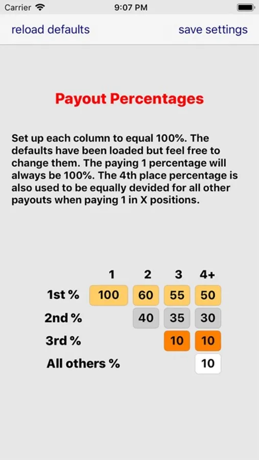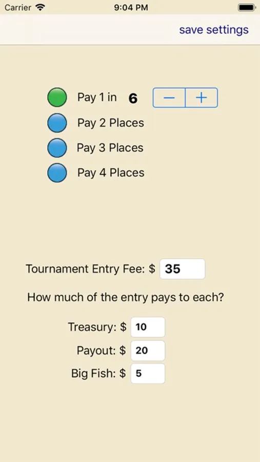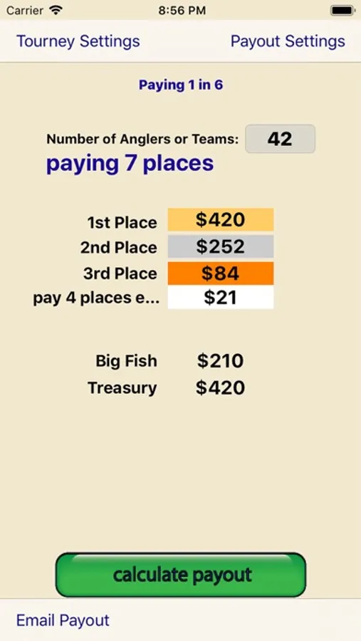 A simple to use tournament fishing payout calculator. This app makes it easy for the tournament director to quickly calculate the tournament payout for 2, 3, 4 or even 1 in X positions. This app will replace your preprinted payout sheets and make payouts quick and easy for your weekend club tournaments. Payouts are rounded to dollar amounts.