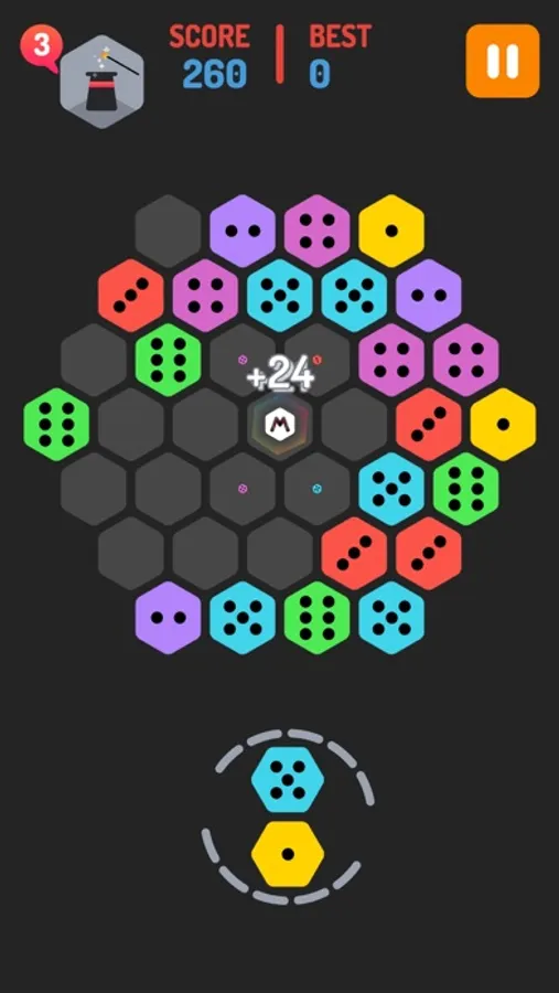 Players control the bottom of the screen the three hexagon group drag to the top of the board. If there is connected to three or more than three the same number of hexagonal adjacent will upgrade to a higher number of squares, "M" is the final number, if three or more than three connected will be completely removed.