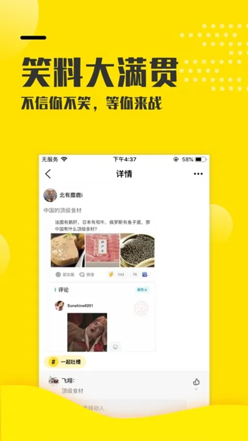 最热辣段子,最爆笑的图片,最有趣的gif短片,承包所有你无聊的时间。更有段友暴强“神评论”,"神段子",花式吐槽,脑洞大开,麻麻问我为什么跪着玩儿手机。
