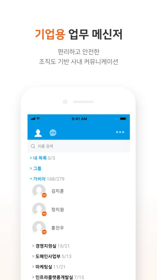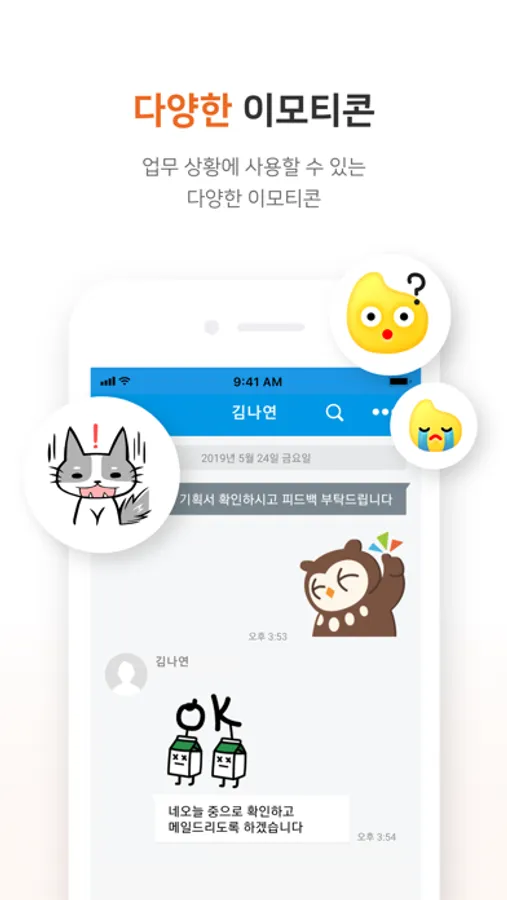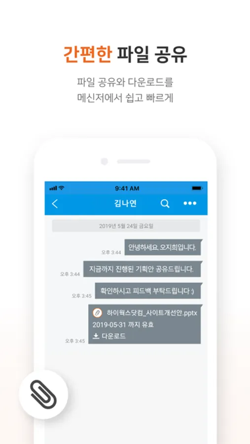 - 문서, 사진 등 업무 관련 파일을 주고받을 수 있습니다.