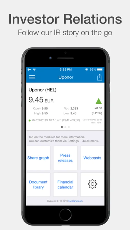 The Uponor Investor Relations app will keep you up-to-date with the latest share price data, stock exchange and press releases, IR calendar events and much more.