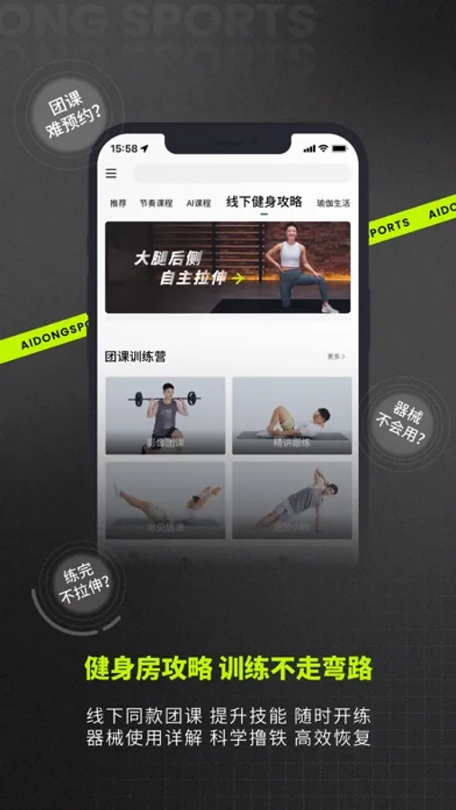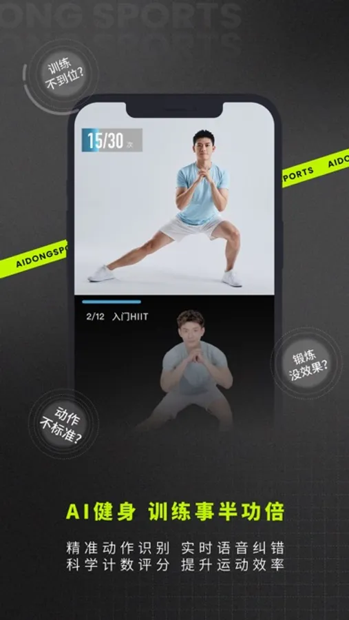 【爱动解决方案:爱动训练全部真人拍摄配合专业细致讲解,跟练更容易,通过训练计划&组队挑战,让目标更明确,更有趣!】