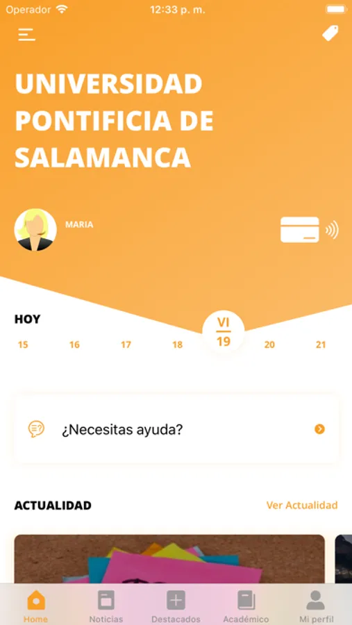 • Perfil privado: Todos tus datos personalizados según tu perfil universitario. Consulta tus asignaturas, calificaciones, etc. Y también tu tarjeta universitaria digital. ¡Siempre la llevarás contigo!