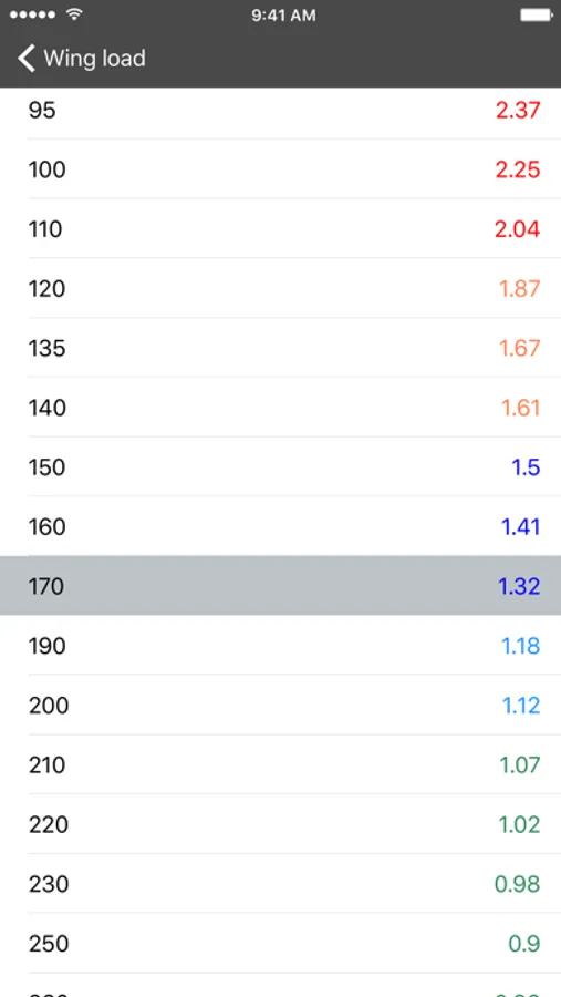 * Clear table for quick wing loading comparsion