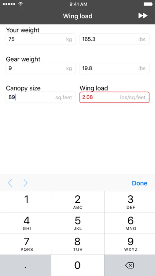 This tool helps you calculate your wing load (based on your weight, gear's weight and on canopy's size) and shows a table for comparing wing load on different wing sizes.
