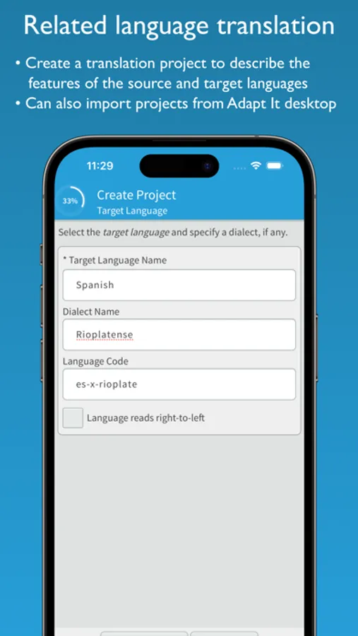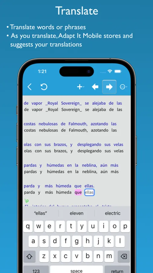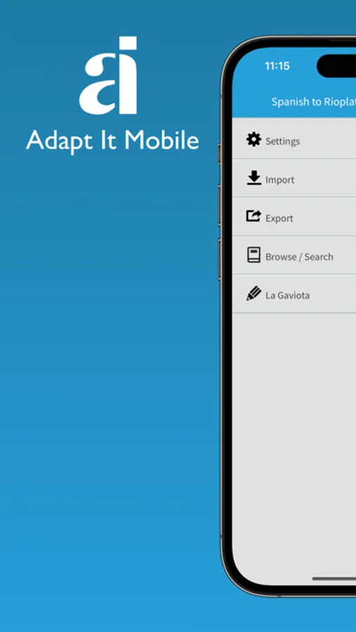 Adapt It Mobile is a simple related language translation tool designed specifically for mobile devices. Using a tablet or smartphone, you can use Adapt It Mobile to quickly translate text from one language to another related language. Previous translations are stored in a translation memory called a Knowledge Base, and are suggested the next time that particular word or phrase is encountered.