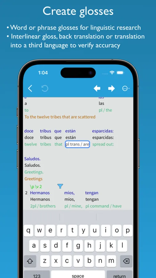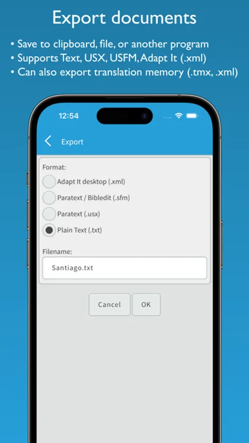 Adapt It Mobile is able to import and export .usfm, .usx, and Adapt It desktop (.xml) documents, as well as general-purpose text files such as those used for health and literacy projects. Text snippets can also be copied in for translating.