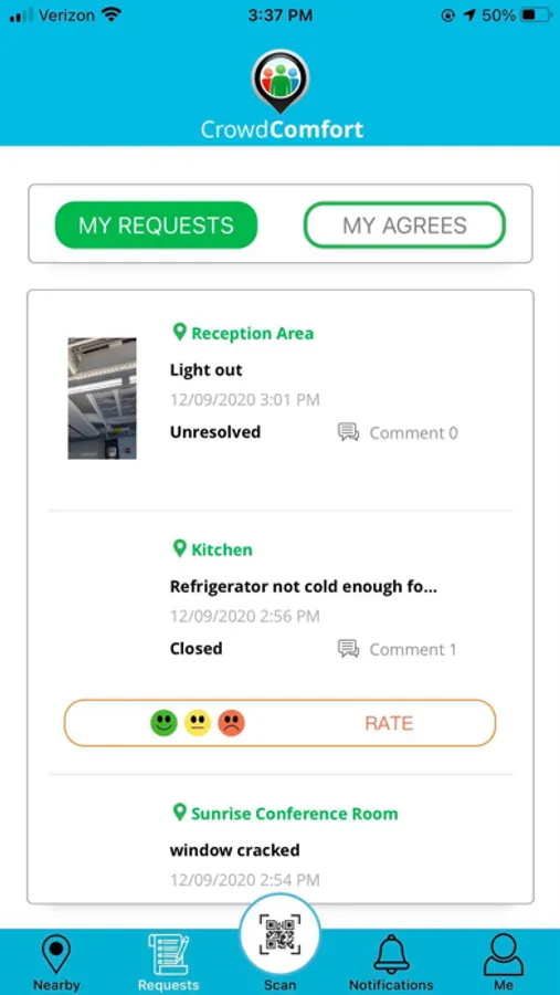 CrowdComfort offers employees and tenants a platform to easily report building issues, including maintenance, health, safety, comfort, and IT. These crowd-sourced, geo-positioned reports are delivered to managers in real time, who can leverage this data to drive employee engagement, productivity, efficiency, and comfort.