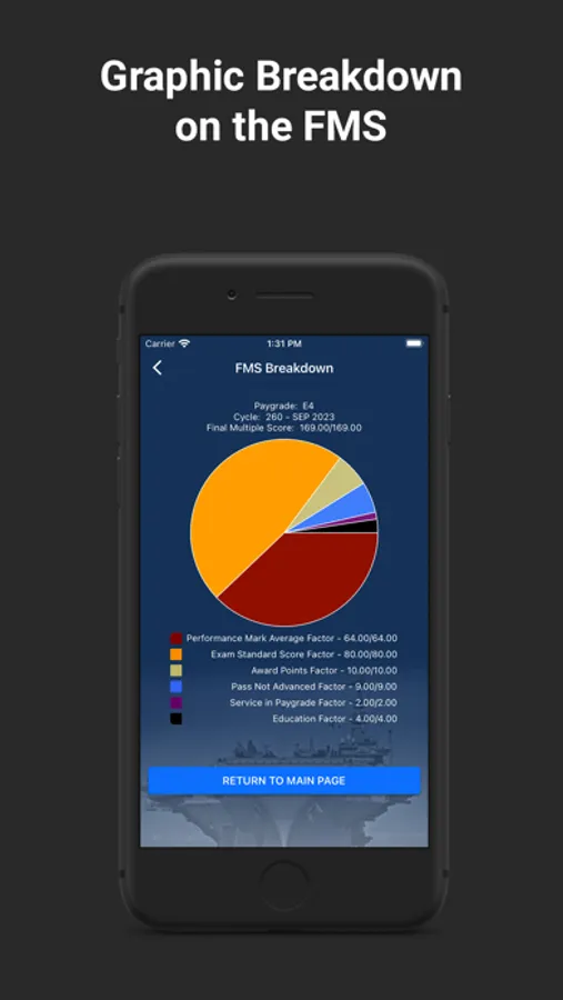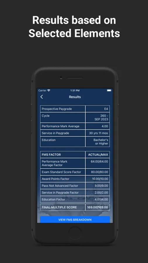 -- Personalization: The FMS Calculator mobile app is programmed to account for the different formulas used at each paygrade and gives users the ability to display maximum points that can be accumulated for each element.
