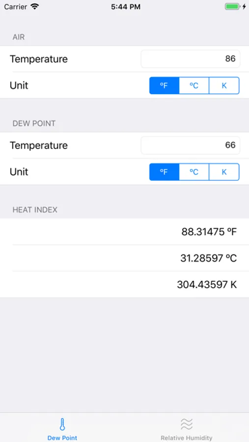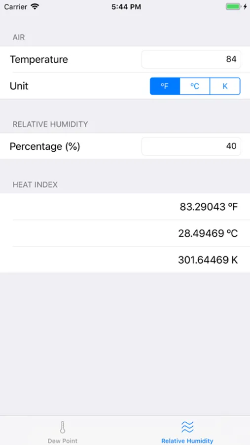 Calculate Heat Index values offline on the fly! Just input your values and the heat index value will be automatically calculated as you type. Supports degrees Celsius, Fahrenheit and Kelvin. You can find the heat index by either providing the dew point or relative humidity.