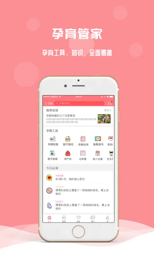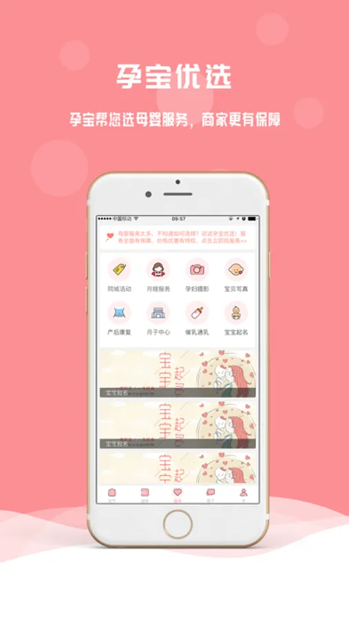 孕宝,首个与妇幼类医院深度合作的软件,以独有地专业地医疗服务和全面的备孕、孕期、育儿知识服务于每一个家庭。